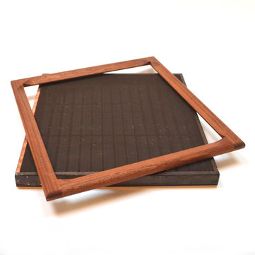 Jedes der Einsteiger-Schöpfsiebe wird komplett in Deutschland hergestellt. Ein regionaler Schreiner fertigte die ersten Holzrahmen und –deckel nach unseren Vorgaben klimafreundlich aus recyceltem Bauholz (Treppenstufen), das dadurch neu und sinnvoll genutzt wurde. Das Mahagoniholz ist wasserfest verleimt und sorgfältig mit Leinöl imprägniert. Nach der Trocknung werden in Handarbeit das Stütz- und Velinobergewebe aus Bronze befestigt. Zusammen gewährleisten diese eine gute Drainage und ermöglichen ein einfaches Aufnähen von Wasserzeichen. Die Kanten werden mit einem aufgenagelten Messingband rundum abgeschlossen. Das Sieb hat drei bzw. vier Stützrippen, die dafür sorgen, dass das Gewebe plan bleibt.
